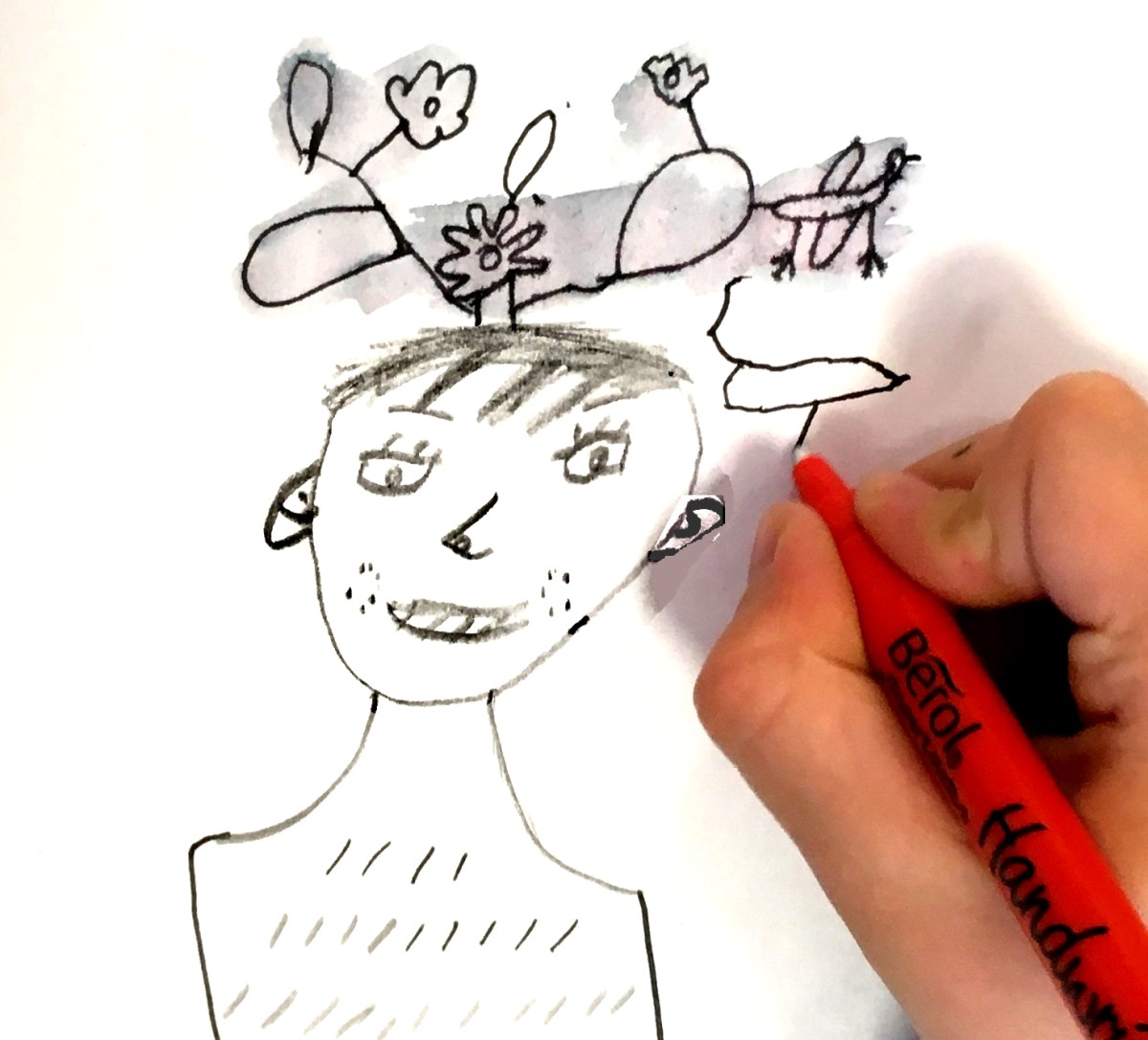 I worked with year 4 children at Rye Primary Academy at the exhibition. I asked them to simply begin by copying one of the drawings and then add their own ideas to complete the picture. They could invent a name, add the character’s home, pets, thoughts, speech, and to perhaps imagine the moment before and after the moment in the image.