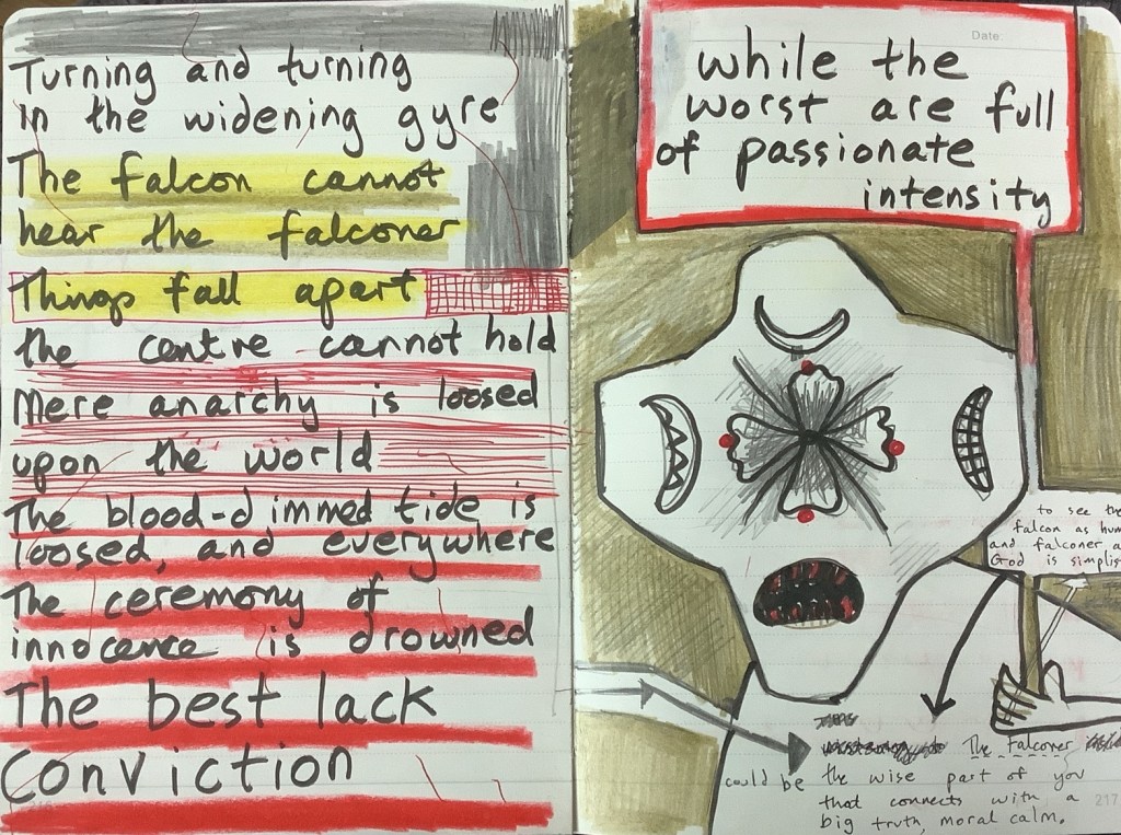 I was reading this amazing, and perennially relevant poem and reflected on the poem through drawing and copying out the words in my sketchbook. I read poems like this- drawing as I read, and copying out bits that mean a lot to me.